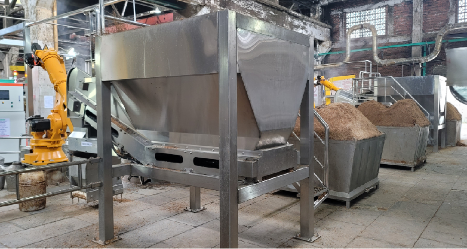 酿酒车间4口甑,用晾糟机、上料机、配粮糠曲机,搭配机器人上甑系统。由原来的14人缩减至7人。且机器人上甑保障了糟醅上甑的疏松、平整、均匀、使得上汽更均匀,出酒浓度更高,出酒量比人工高2~4%(数据来源于厂家数据统计)。
